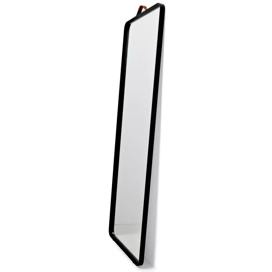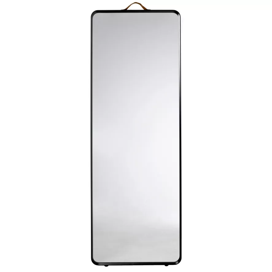 De Norm Floor Mirror spiegel van Audo Copenhagen heeft een breedte van 60 centimeter, een diepte van 3,5 centimeter en een hoogte van 170 centimeter. De spiegel is gemaakt van glas, gepoedercoat aluminium en leder. De spiegel is leverbaar in twee kleuren: zwart en wit. De spiegel leunt tegen de wand.