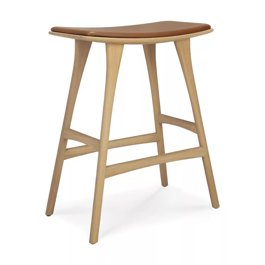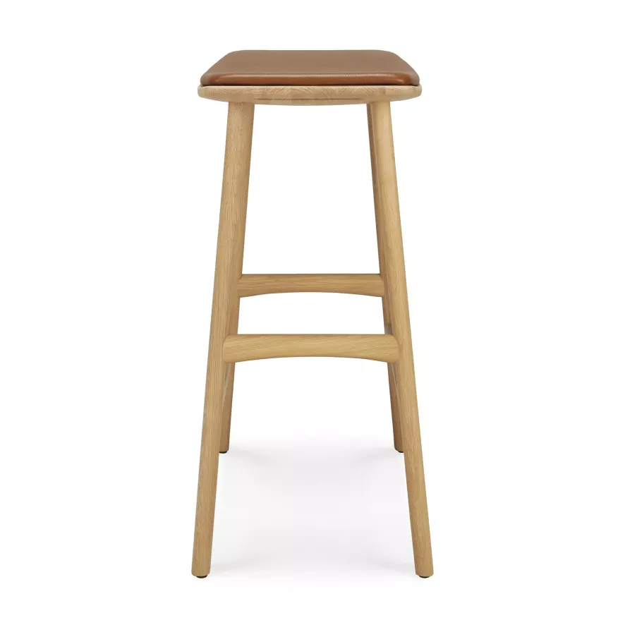 De Osso barkruk 67 gestoffeerd van Ethnicraft heeft een breedte van 57 centimeter, een diepte van 33 centimeter en een hoogte van 69 centimeter. Deze barkruk heeft een zithoogte van 67 centimeter. De barkruk is gemaakt van FSC-gecertificeerd, massief eikenhout en is met een olie afgewerkt. De zitting van de barkruk is bekleed met cognac leer. De kruk heeft een gewicht van 6 kilogram en heeft een maximum draaggewicht van 135 kilogram. De Osso barkruk 67 gestoffeerd van Ethnicraft is in verschillende uitvoeringen verkrijgbaar en is alleen geschikt voor gebruik binnenshuis.