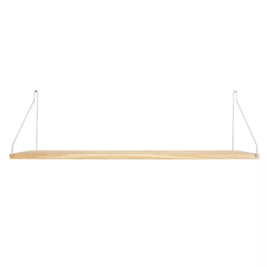 De Shelf wandplank 80×27 van Frama heeft een breedte van 80 centimeter en een diepte van 27 centimeter. De plank is gemaakt van naturel geolied eiken, donker eiken of witgeolied eiken. De Shelf wandplank hang je op aan de beugels, deze zijn in diverse kleuren beschikbaar.