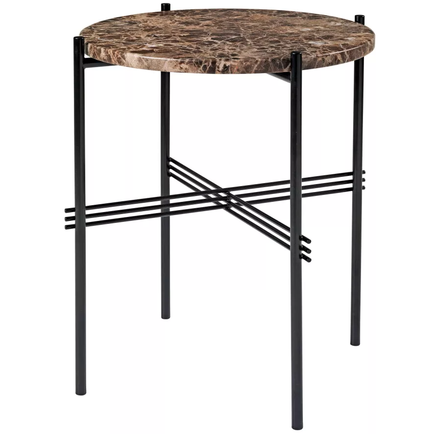 De TS bijzettafel 40 van Gubi heeft een diameter van 40 centimeter en een hoogte van 51 centimeter. Deze bijzettafel heeft een onderstel van zwart, gepoedercoat staal of messing en een tafelblad van marmer of travertijnsteen. De poten van de tafel zijn voorzien van vloerbeschermers en voor beide stenen tafelbladen kun je uit diverse soorten en kleuren kiezen. De bijzettafel heeft een gewicht van 8,5 kilogram en komt uit de gelijknamige TS collectie van Gubi. De TS bijzettafel 40 van Gubi is in verschillende uitvoeringen en formaten verkrijgbaar.