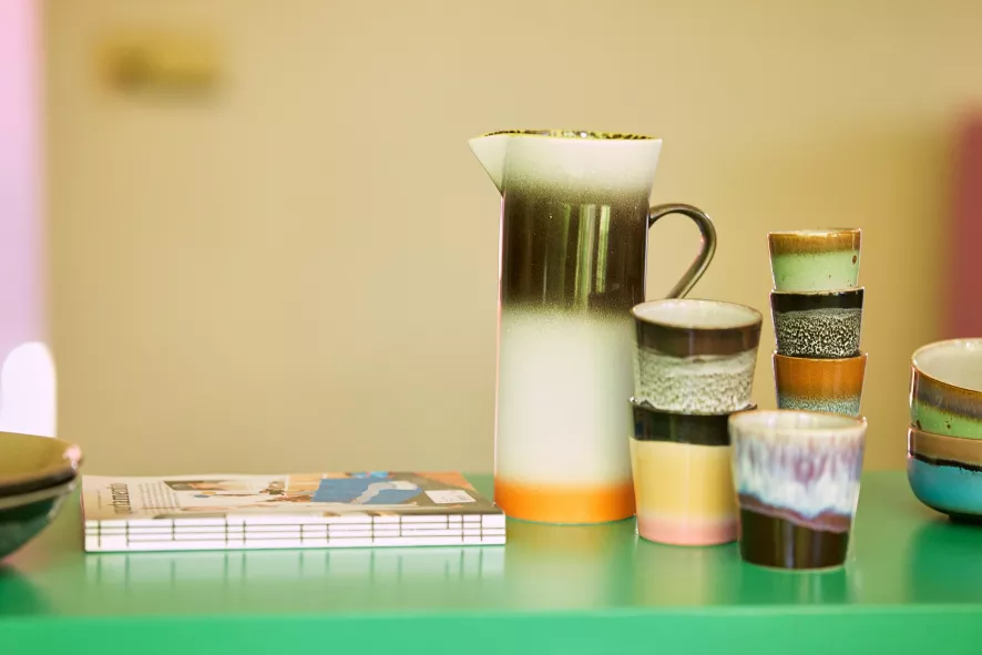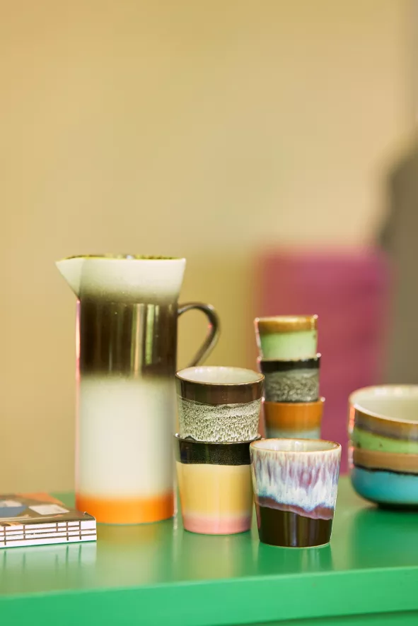 De 70’s Ceramic kan van HKliving is gemaakt van keramiek, afgewerkt met een reactief glazuur. De kan heeft een lengte van 10,2 centimeter, een breedte van 11,9 centimeter en een hoogte van 24 centimeter. De kan weegt 850 gram. De 70’s Ceramic waterkan kan in de afwasmachine, in de magnetron en is voedselveilig. Omdat de kan met de hand wordt afgewerkt kan hij een klein beetje afwijken van de foto’s. De kan heeft een capaciteit van 1250 milliliter. De kan is in verschillende kleur combinaties beschikbaar.