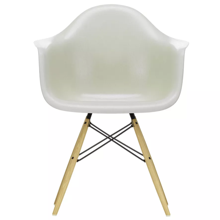 De Eames Fiberglass DAW stoel met essen onderstel van Vitra heeft een breedte van 62,5 centimeter, een diepte van 60 centimeter en een totale hoogte van 83 centimeter. De stoel heeft een zitkuip van glasvezel en heeft een zithoogte van 43 centimeter, een zitdiepte van 52 centimeter en armleuningen op een hoogte van 68 centimeter. Het onderstel van de stoel is gemaakt van zwart staaldraad en essenhout uit West-Europa en Polen. De Eames Fiberglass DAW stoel met essen onderstel van Vitra is verkrijgbaar in verschillende kleuren en met verschillende onderstellen.